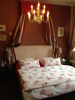 rot & goldene farbene Wandtapeten, goldener Kronleuchter, Lichtdimmer