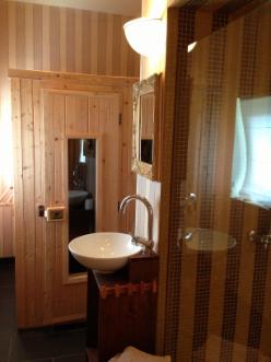 Bad mit eigener Sauna, großer Dusche, Fußbodenheizung, Lichtdimmer