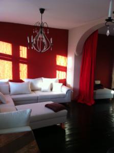 großes Wohnzimmer mit Schreibtisch, Kronleuchter, Lichtdimmer